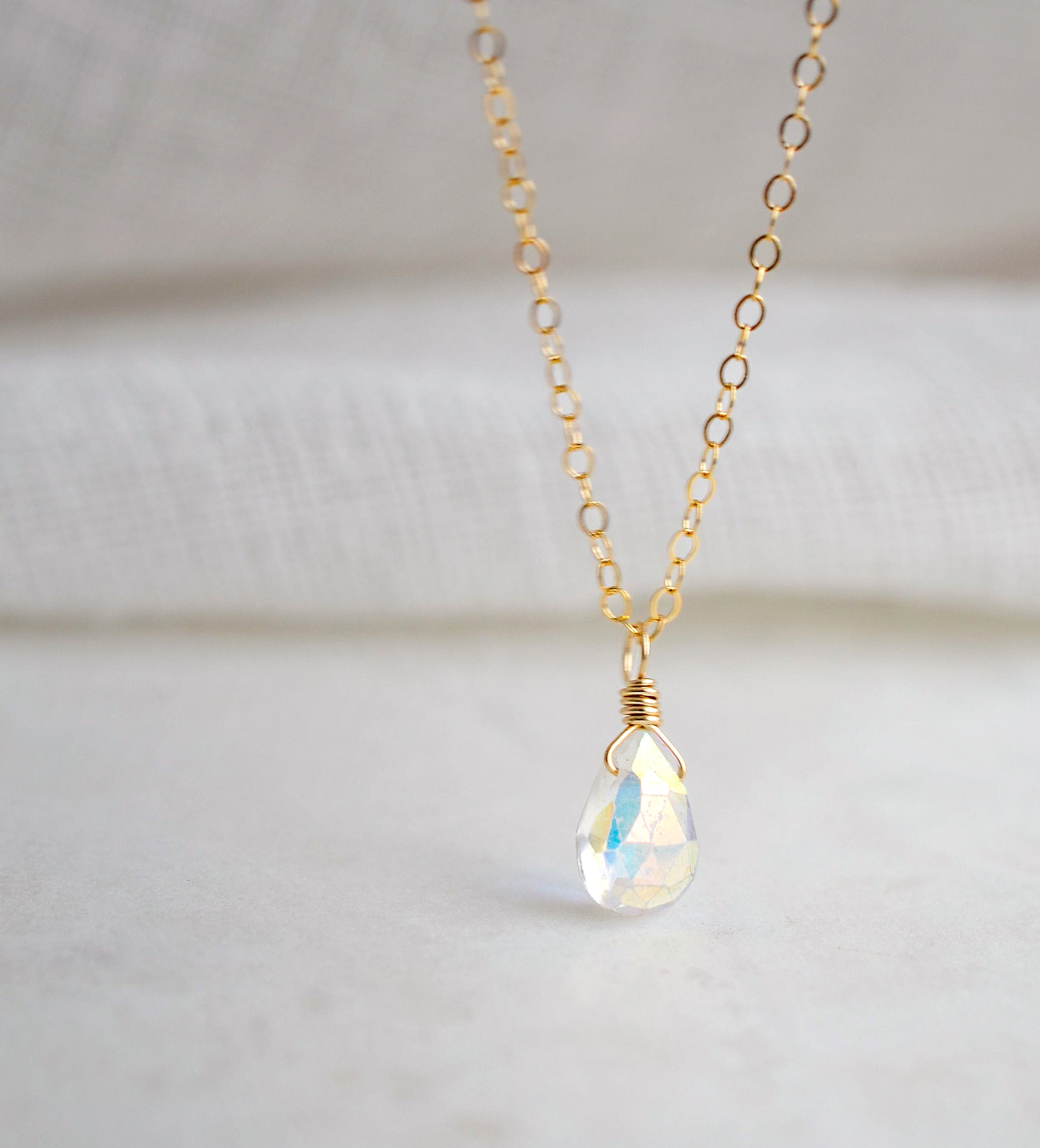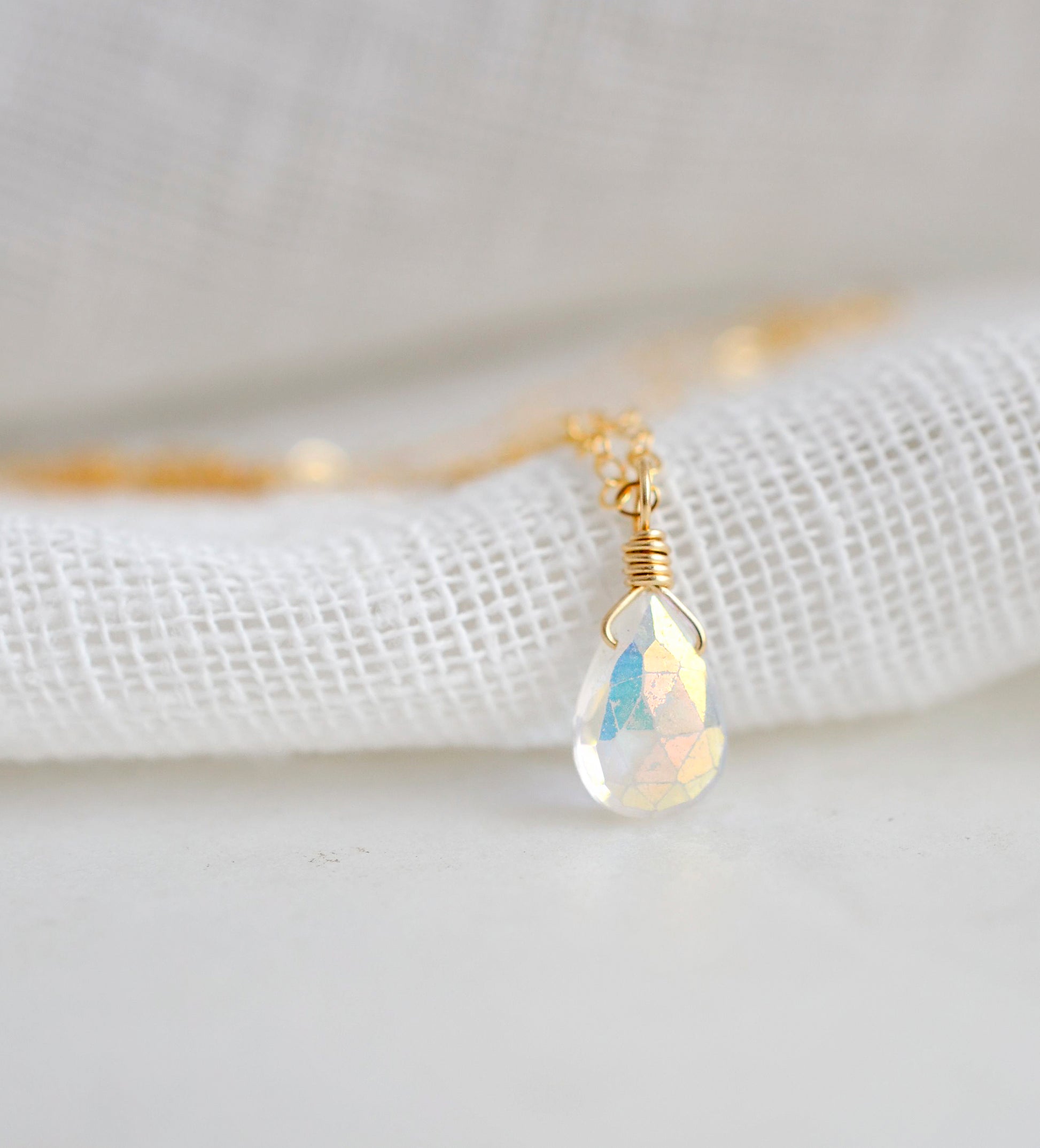 This necklace features a faceted teardrop of Angel Aura Quartz set onto either a sterling silver or 14k gold filled chain.