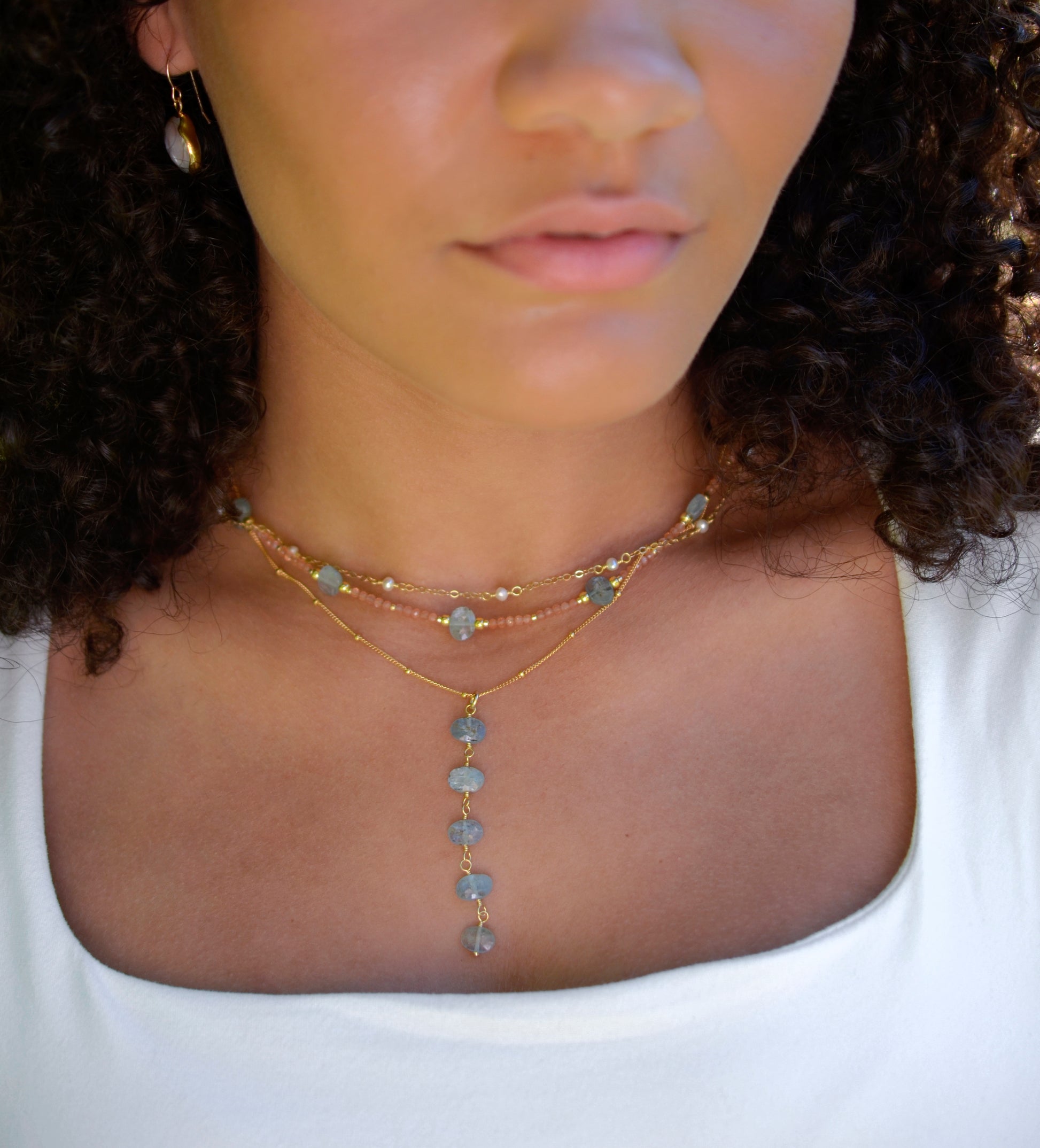 This handcrafted pendant features five natural faceted apatite gemstones set onto a sterling silver or 14k gold filled chain. Chains are available in a beaded style or a simple style. Each stone varies slightly in color, with some pieces being more blue or green. The pendant hangs approximately 2.75 inches from the chain length.