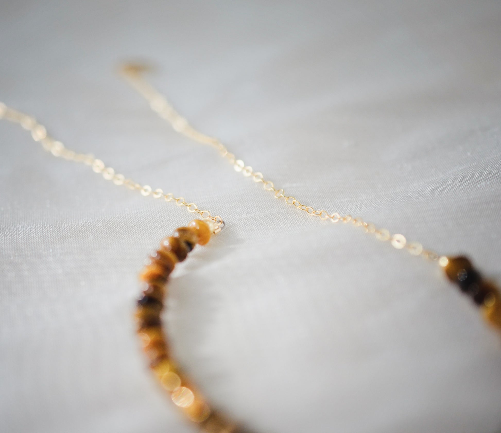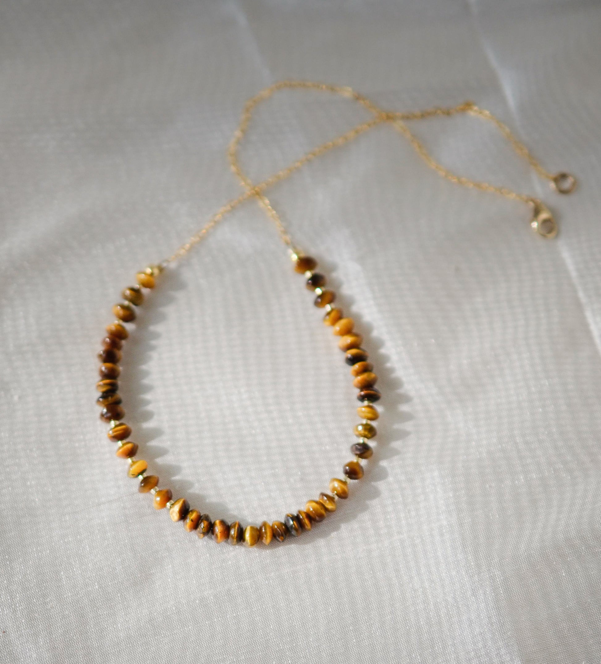Ground yourself with our handmade beaded necklace, featuring smooth polished, genuine Tiger Eye gemstones on a sterling silver or 14k gold filled chain. Its captivating golden-brown hues and chatoyant bands (cats eye effect) make it the perfect jewelry for everyday!