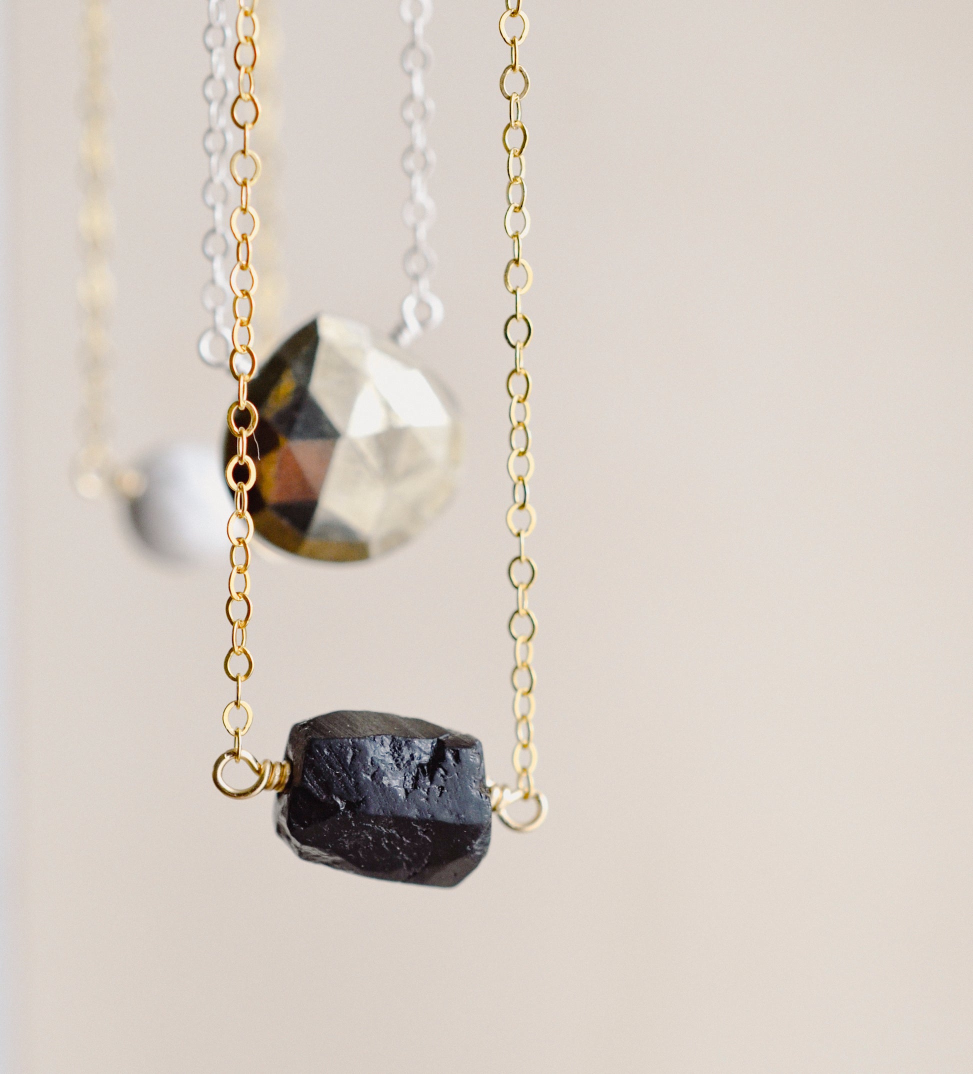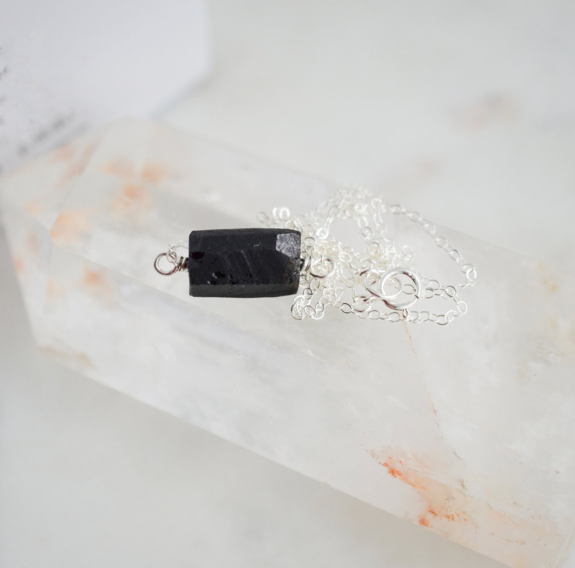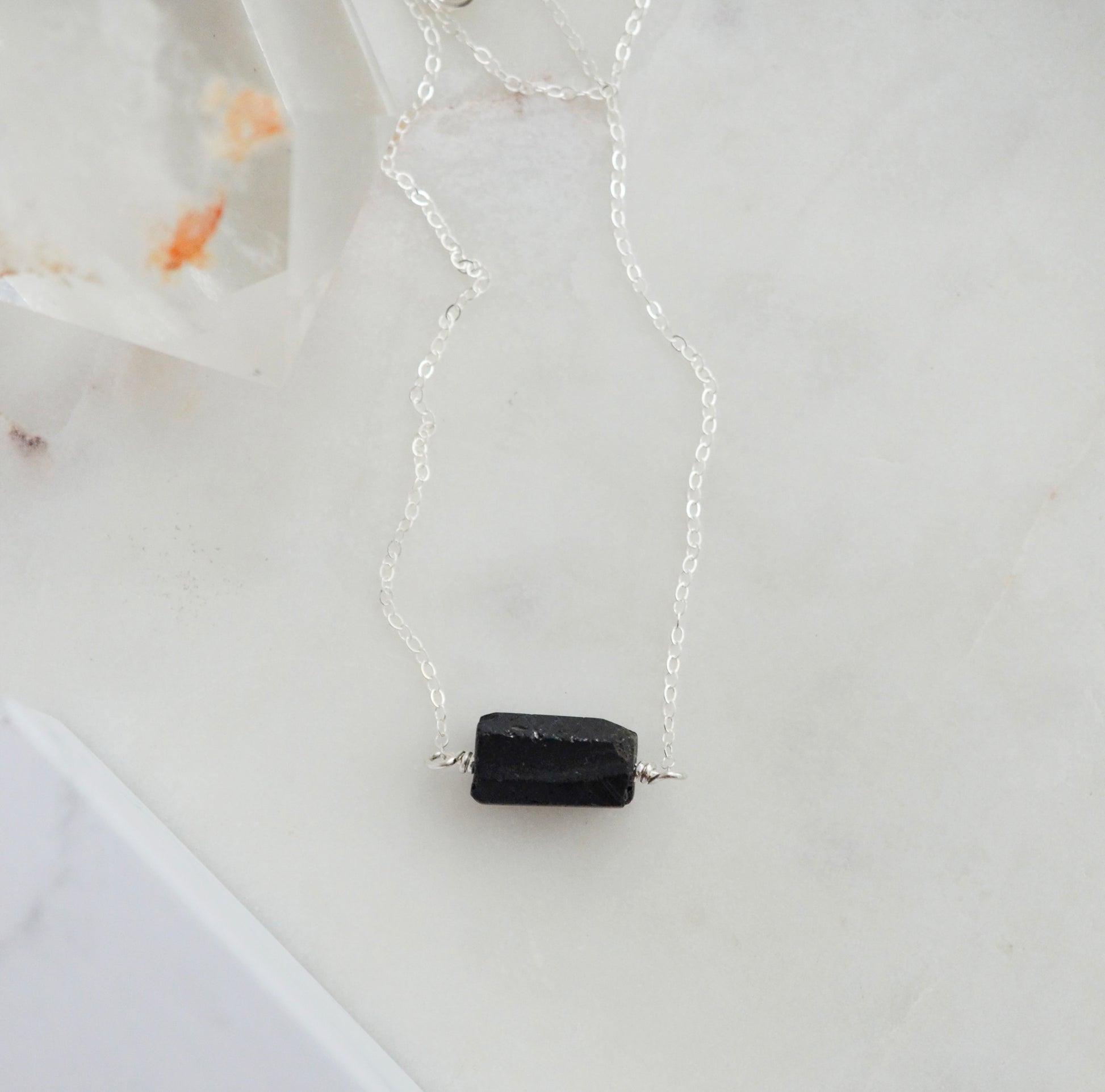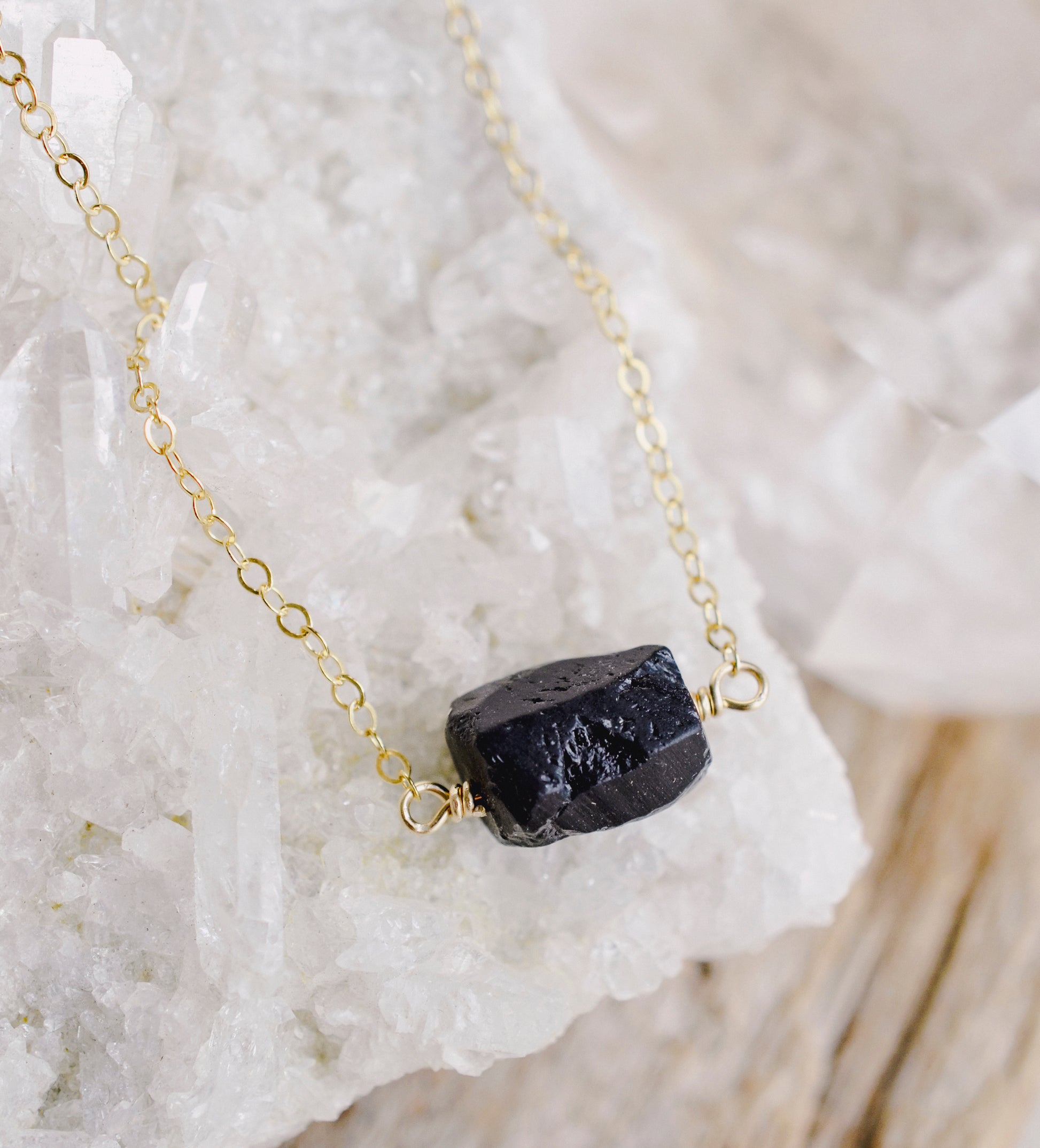 This necklace is handmade with a genuine, raw, black Tourmaline crystal set onto a sterling silver or 14k gold filled chain. The stone has a semi-rough, hexagonal form with organic imperfections.