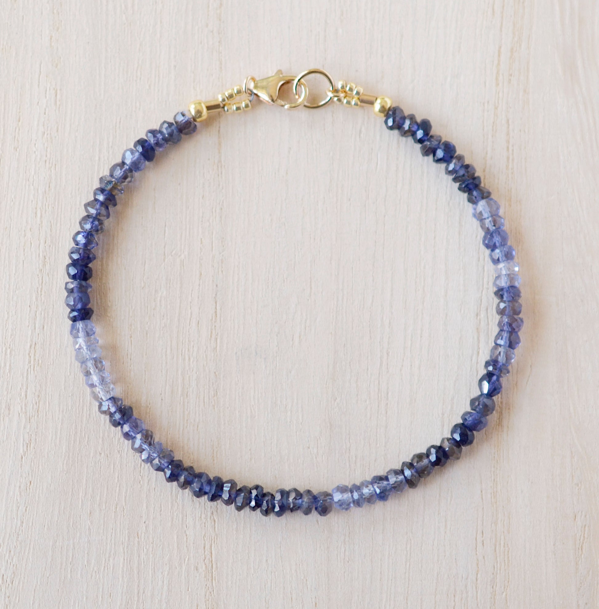 Discover the beauty of Iolite! This stunning, multi-color beaded bracelet is crafted with sterling silver or 14k gold filled and genuine iolite that ranges in dark to light blue. Iolite, named after the Greek word "ios" meaning violet, is a lovely violet-blue gem that is pleochroic. Pleochroism is when a gem displays different shades of color from different angles. So, be prepared if your Iolite looks different from when you last studied it!