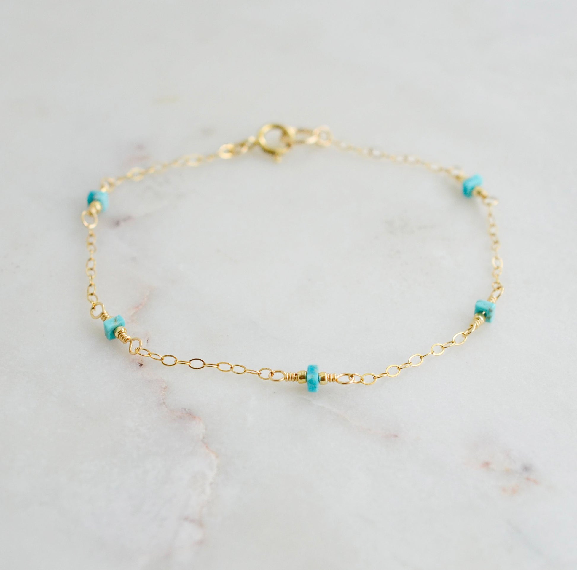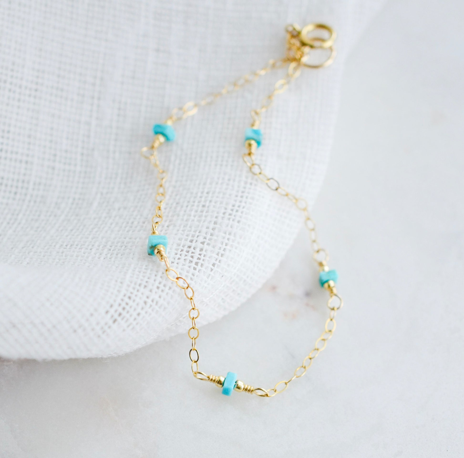 Keep your wrist fresh and stylish with this turquoise chain bracelet. Handmade with genuine, natural square-shaped turquoise stones set onto a sterling silver or 14k gold filled chain, this bracelet is great for layering or a minimalist vibe. Nothing says "natural beauty" like this stunning pop of color!