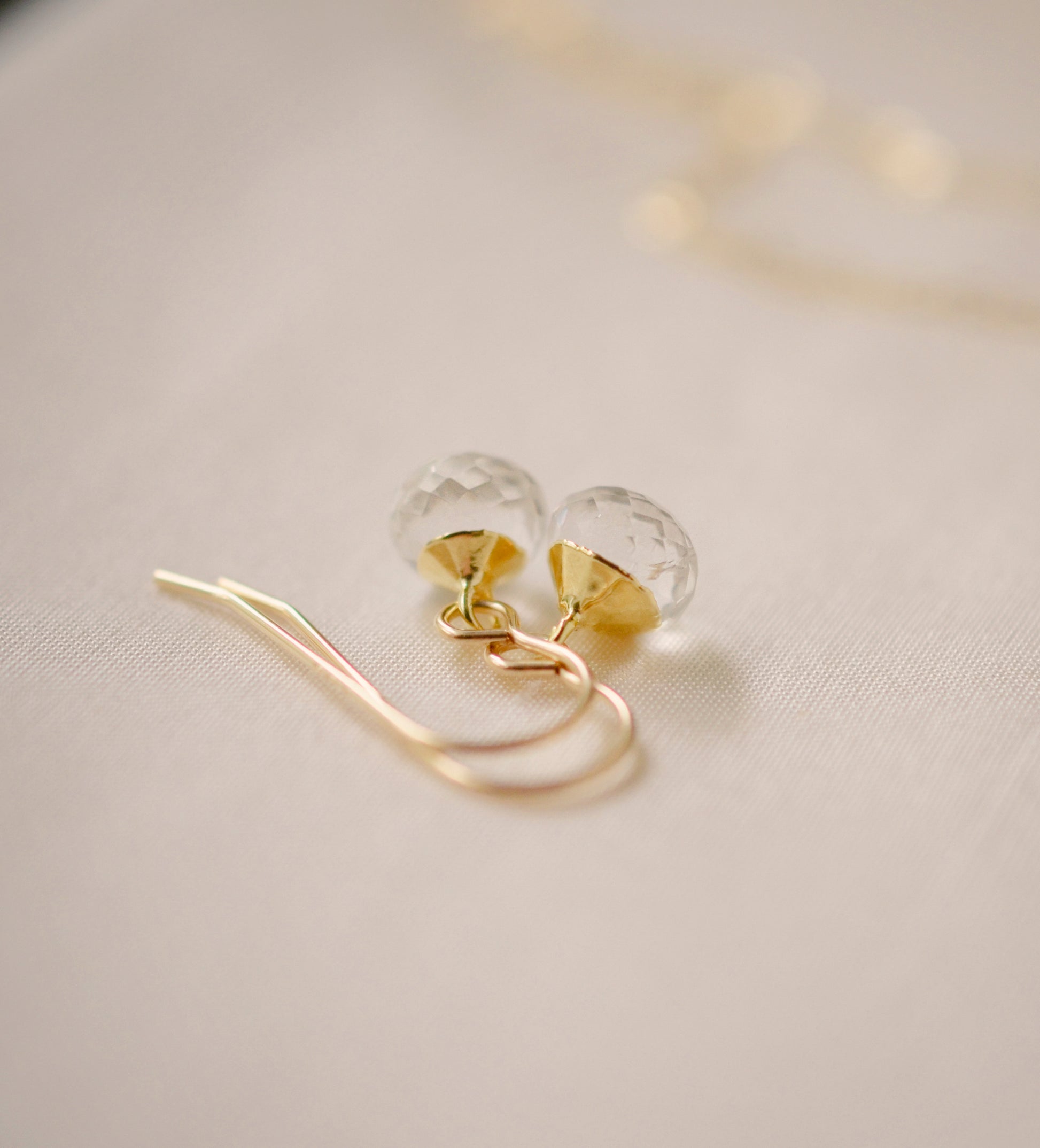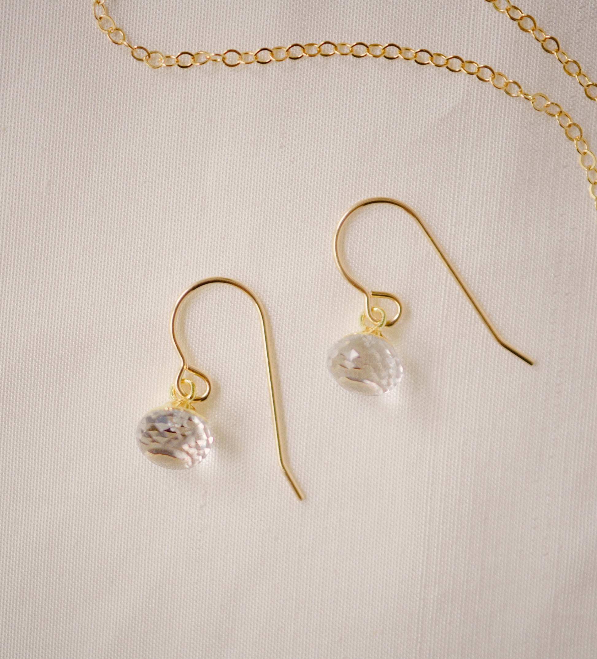 Dipped in 24k gold, these tiny genuine crystal quartz earrings love to sparkle! And since the gems come straight from Mother Nature, you may find an extra special surprise within (a natural inclusion) - if you look closely enough!