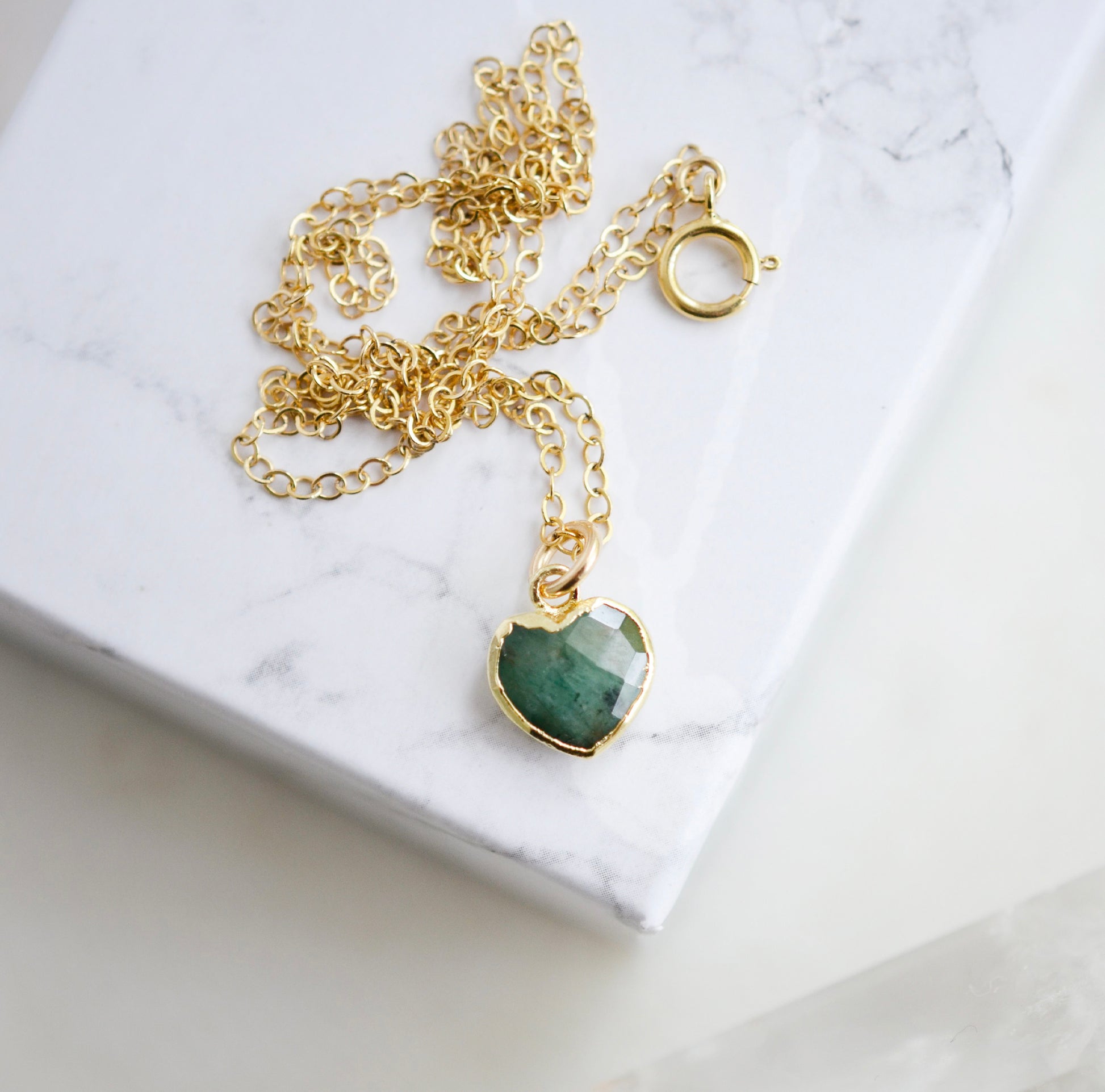 This necklace is handmade with an Emerald faceted heart pendant. Each stone is natural and therefore contains natural inclusions and color variations. Most stones are darker green and contain a mixture of black and/or white coloring within them. They are edged in 24k gold electroplate.