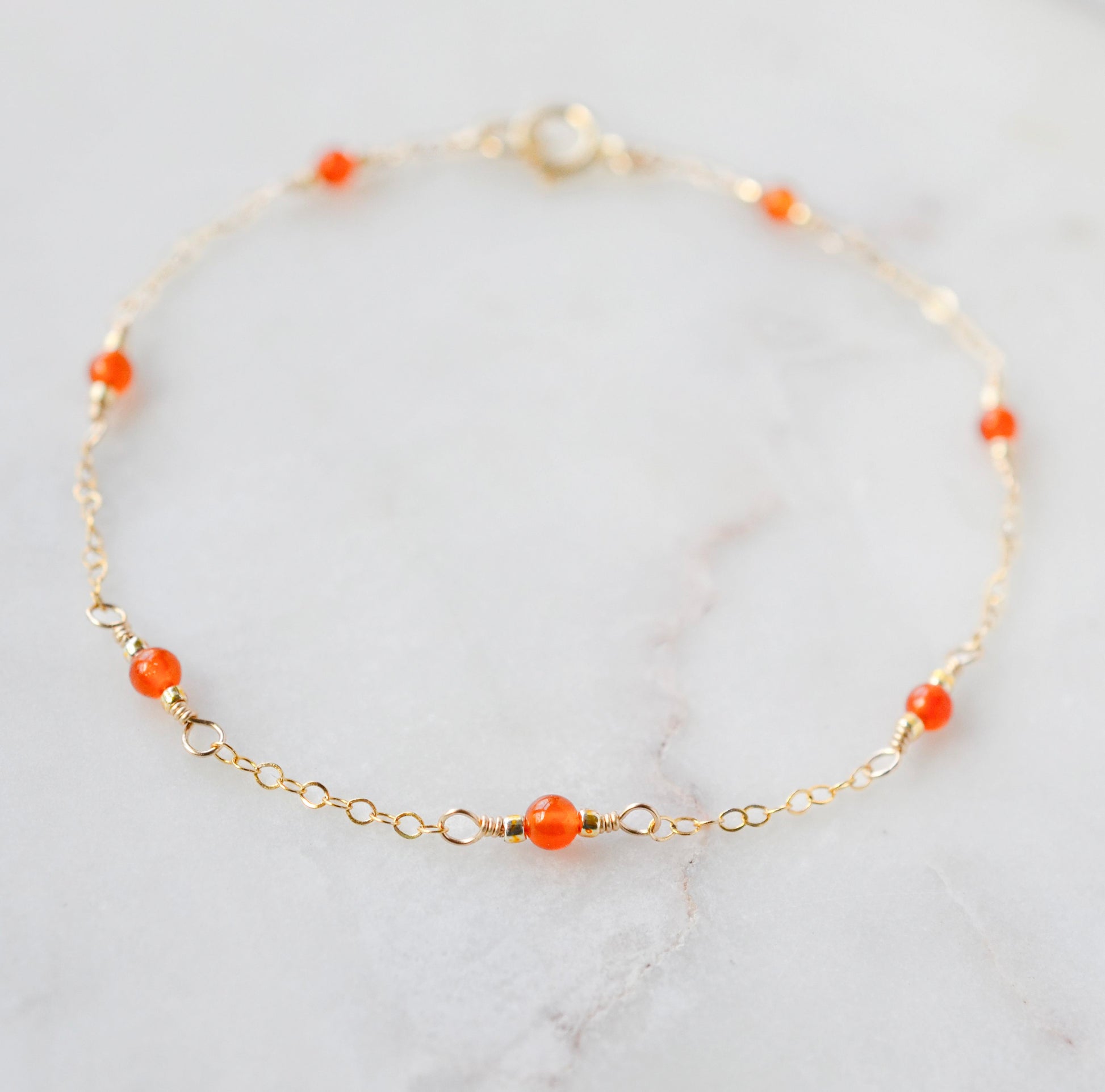 Crafted by hand using real, smooth polished carnelian stones on a chain of sterling silver or 14k gold, this bracelet is perfect for layering or keeping things simple. It's a great present for your mother, girlfriend, or even yourself!
