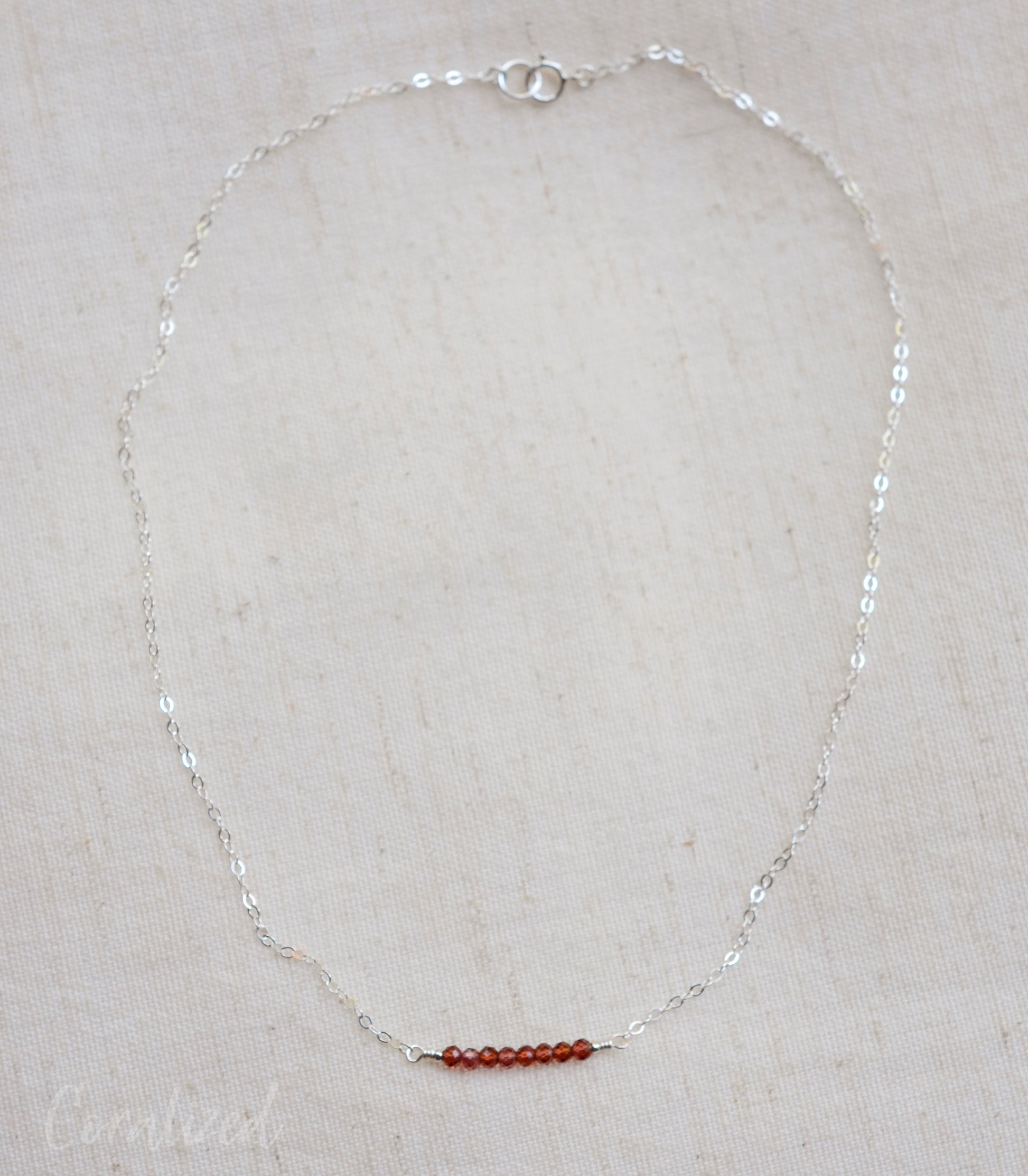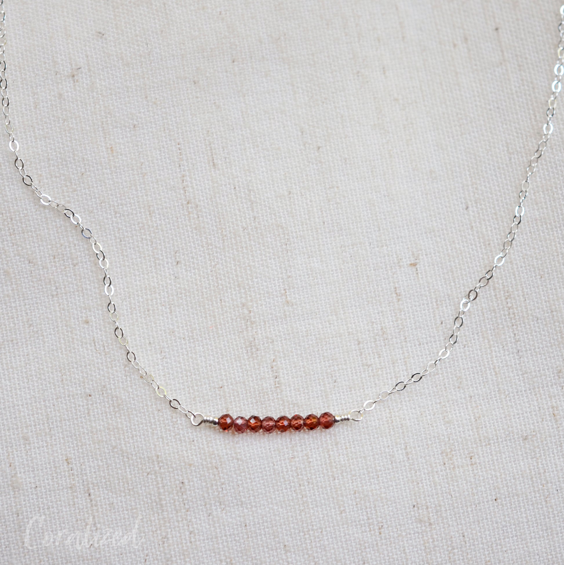 This necklace is handcrafted with tiny, natural garnet gemstones that average 3mm in size. The stone bar length is one inch. Chains are available in sterling silver or 14k gold fill.