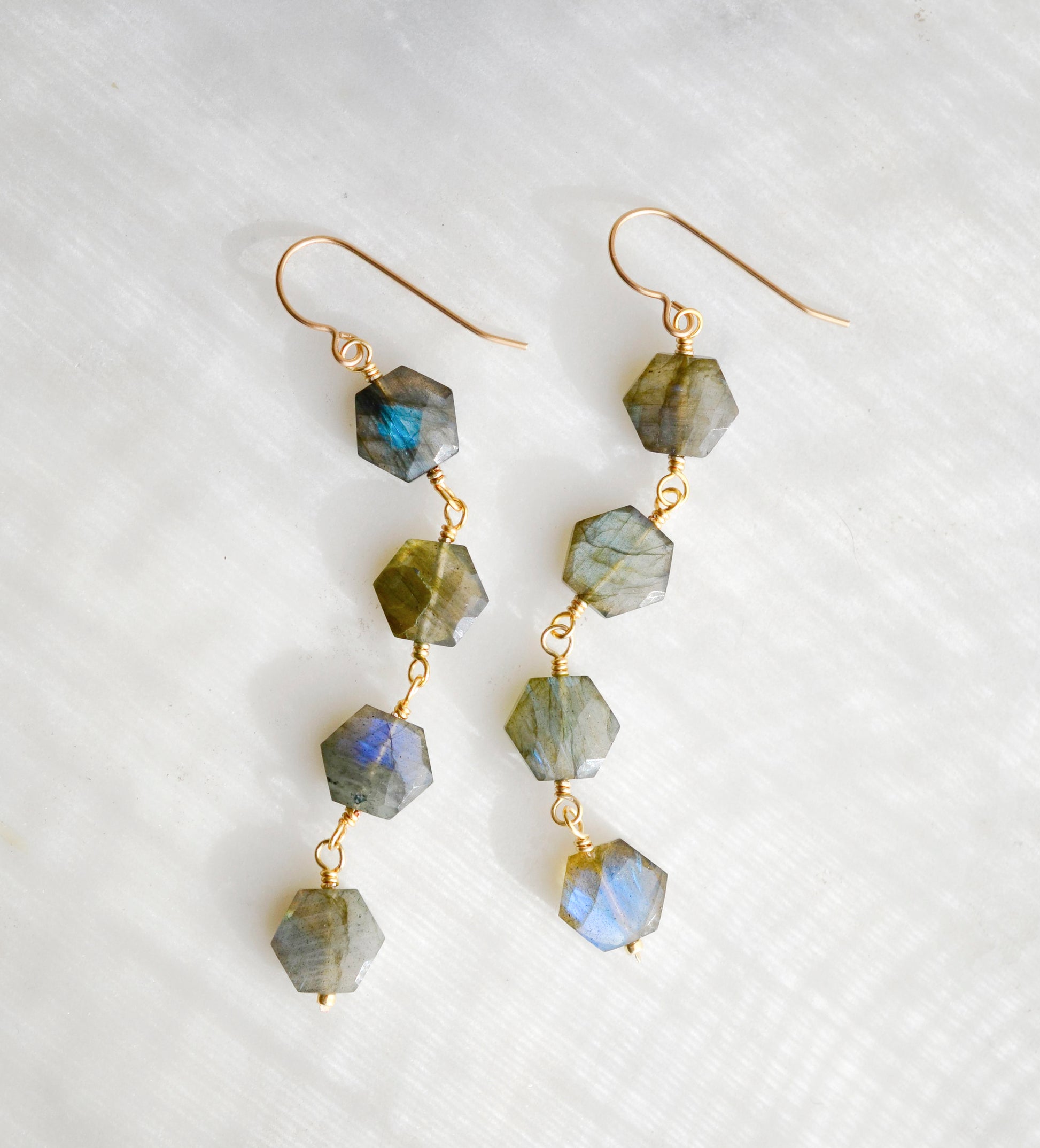 Feeling a bit fancy? These long and lavish Azora Earrings feature hexagonal labradorite that will have you glowing in no time.