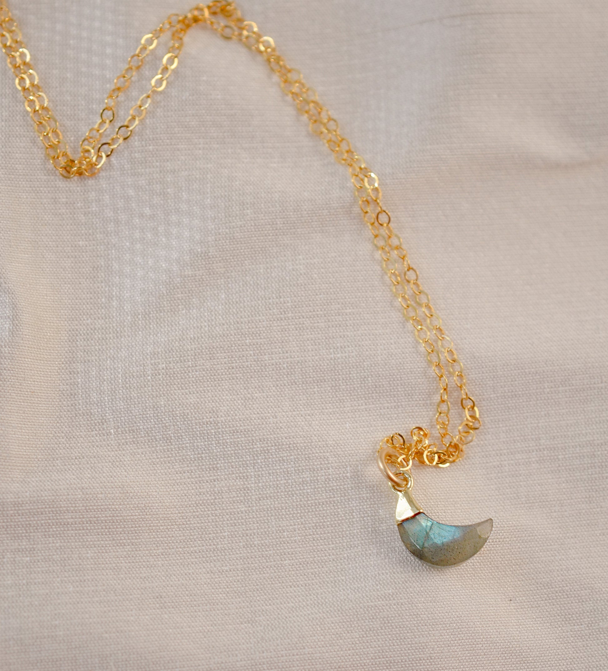 This necklace is handmade with natural Labradorite shaped into a faceted crescent moon. The gemstone's top is bezeled in 24k gold electroplate, while the chain and clasp are 14k gold filled.