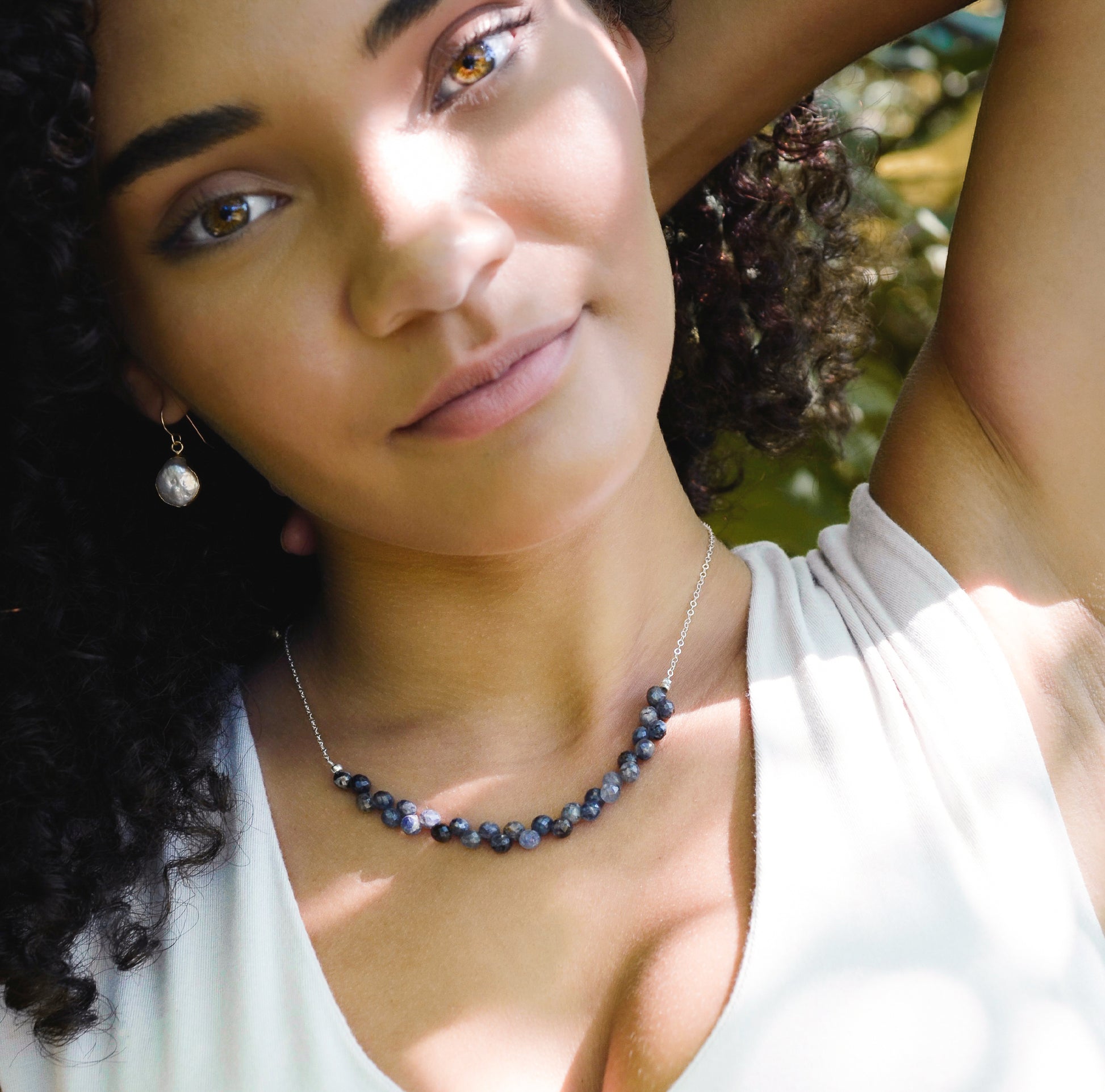 Inspired by the Lyra constellation, this handmade necklace showcases Iolite, a beautiful blue-violet gemstone. This gem, named after the Greek word "ios" meaning violet, is known for its pleochroism--the ability for a stone to appear various colors from different angles. So don't be surprised if your Iolite surprises you with a different hue!