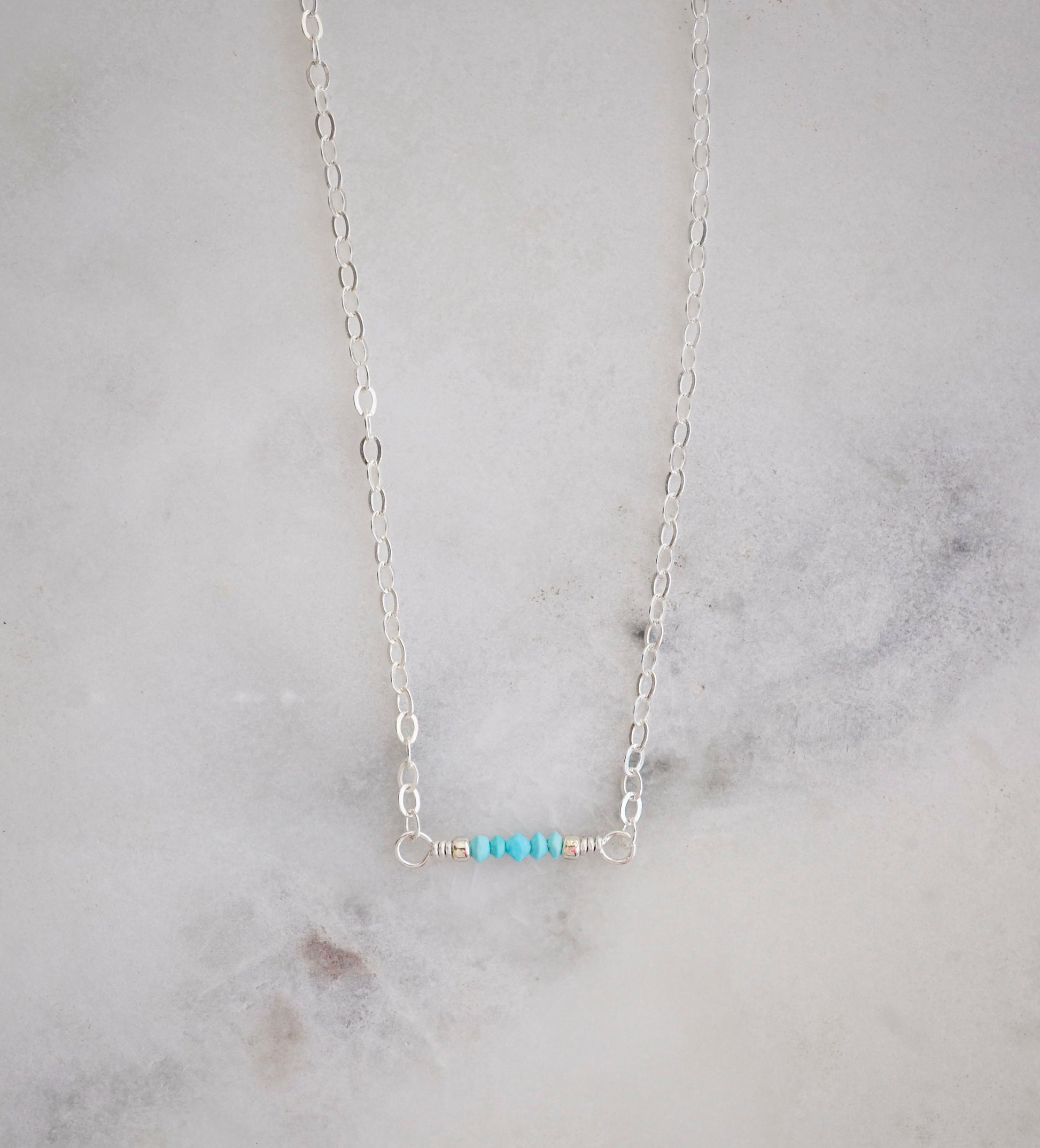 Love a minimalist style? Then this necklace is a must for you! Small, natural Arizona Turquoise stones make up this special piece. Choose to have this necklace made in either 14k gold fill or sterling silver.