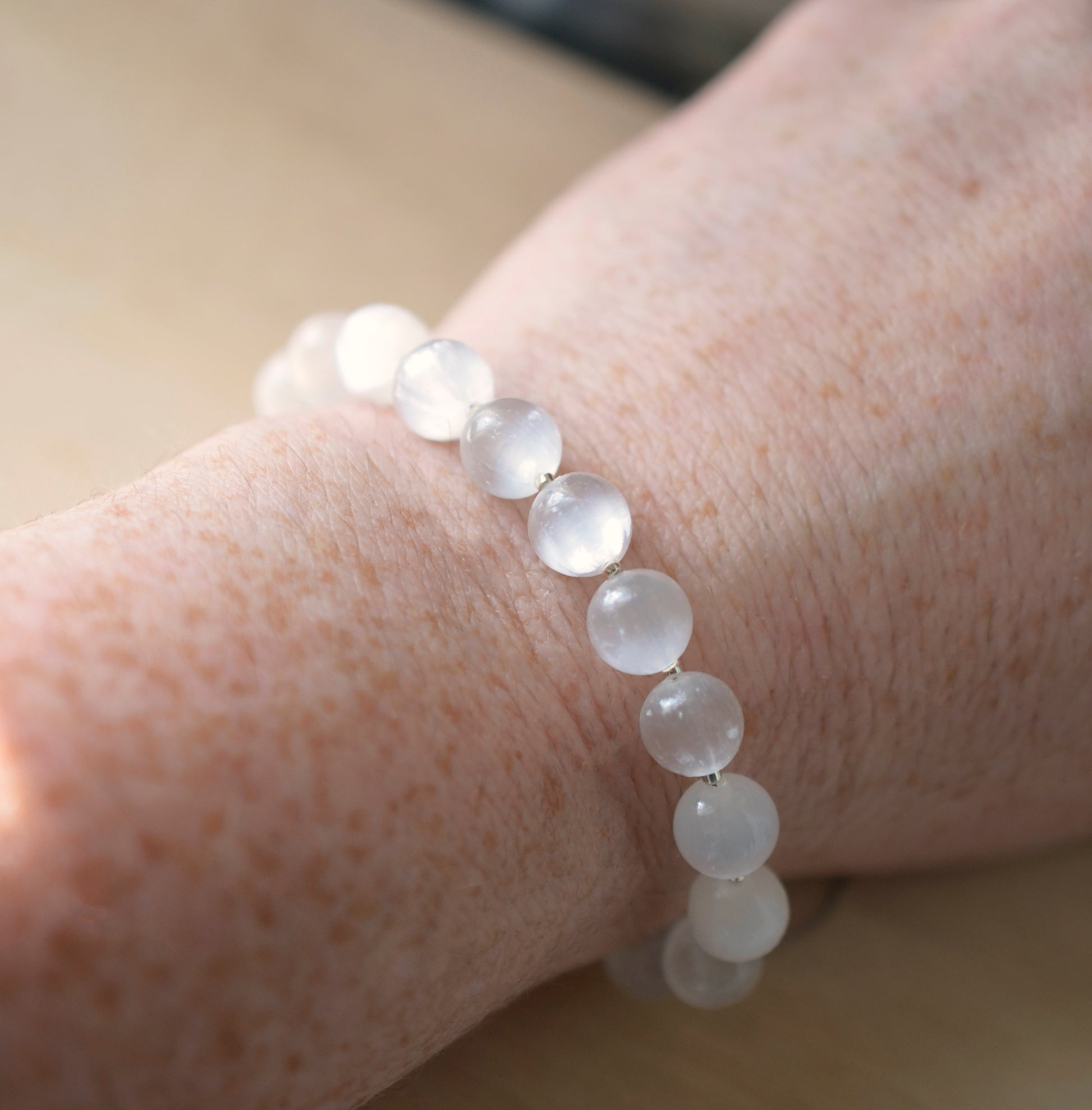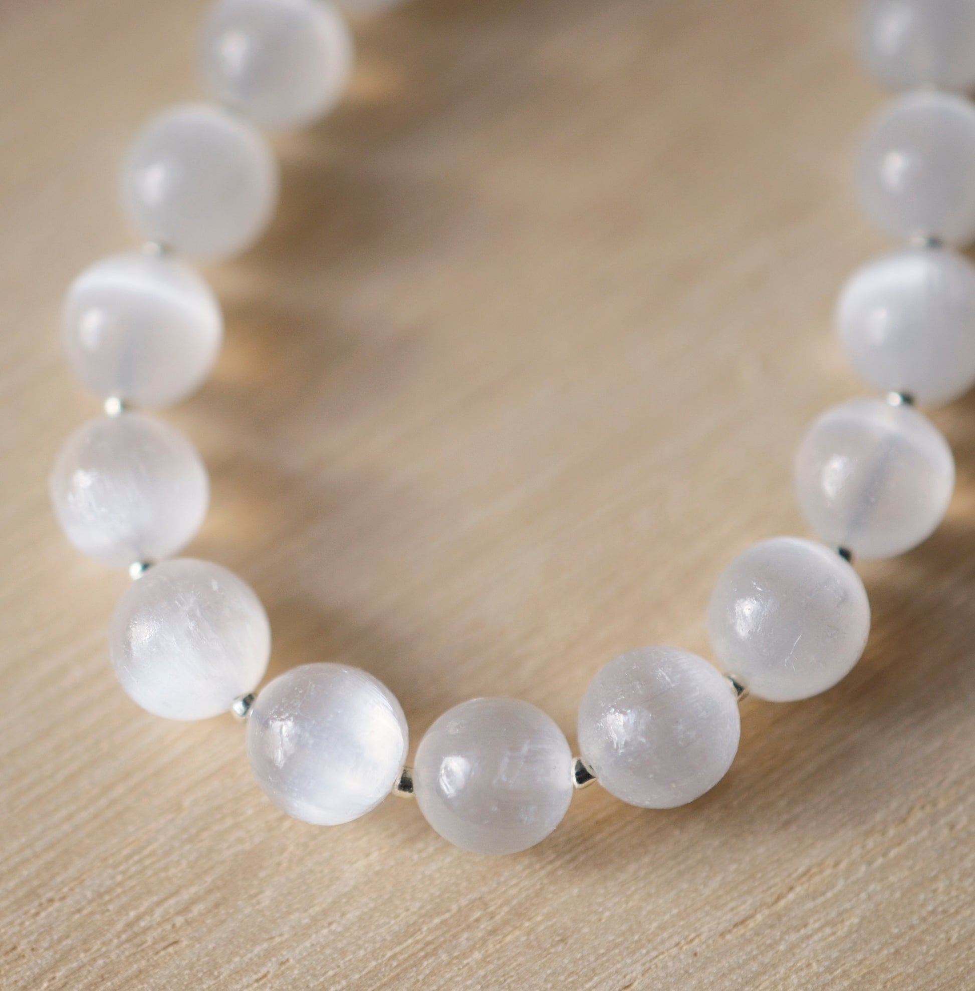 This bracelet is handcrafted with natural, smooth polished Selenite crystals with gold or silver beads in between them. Please measure your wrist to find your size before purchasing. If purchasing as a gift the adjustable size of 6.5 to 7.5" fits most average women.