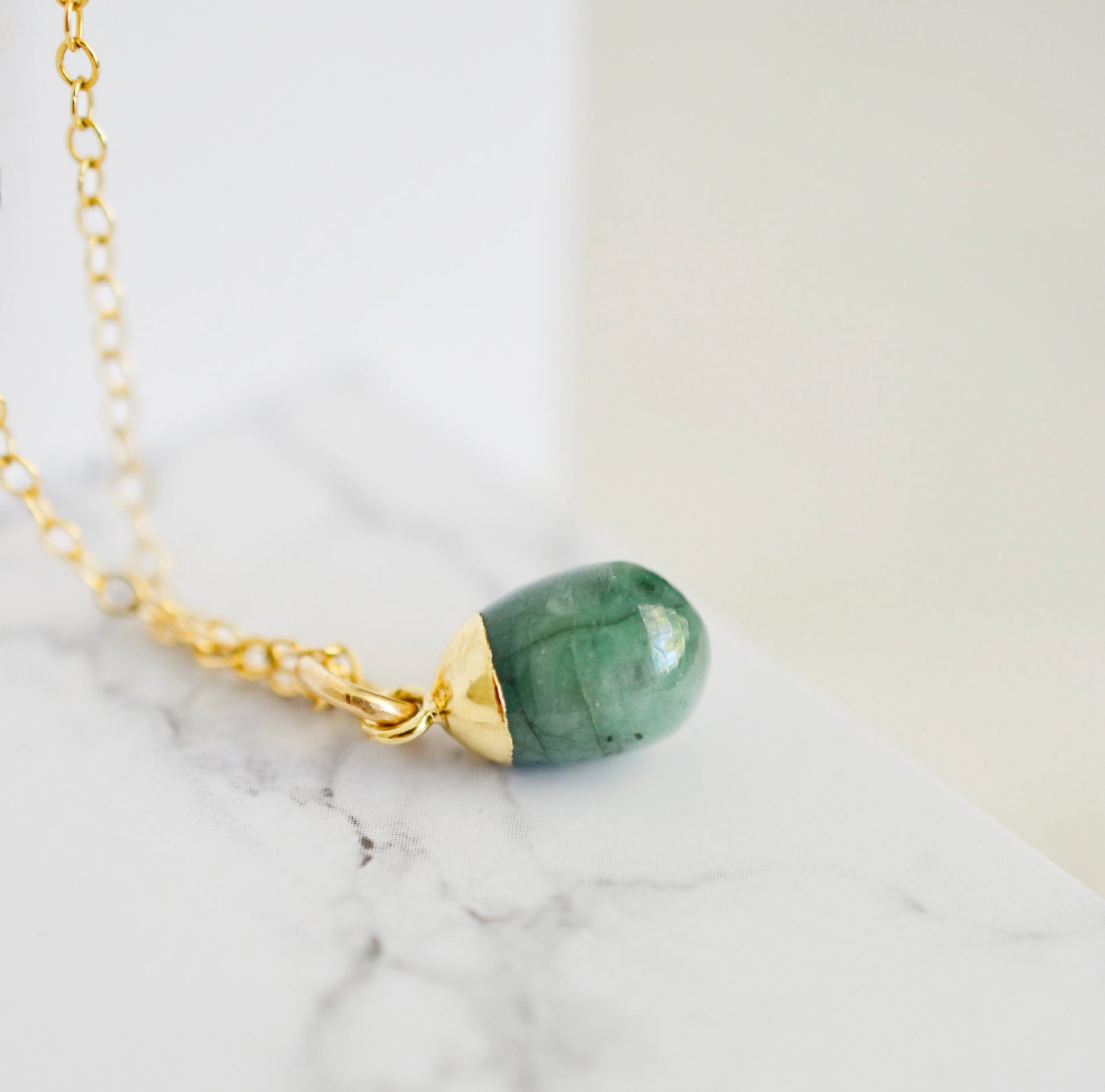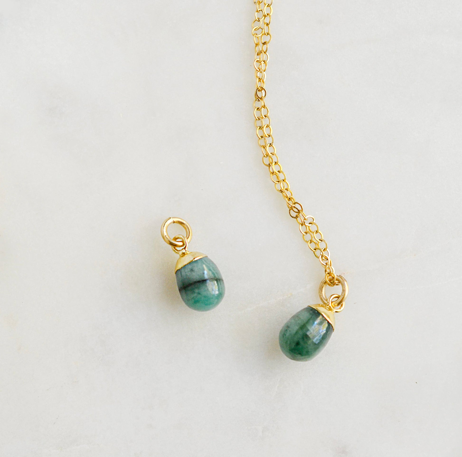 This handmade necklace showcases an natural, genuine emerald pendant in a smooth polished teardrop shape. Each gemstone will vary from dark to light green and can contain a mix of Black Tourmaline, Biotite Mica, or White Feldspar. The stone's bezel is 22k gold electroplate, while the chain is 14k gold filled.