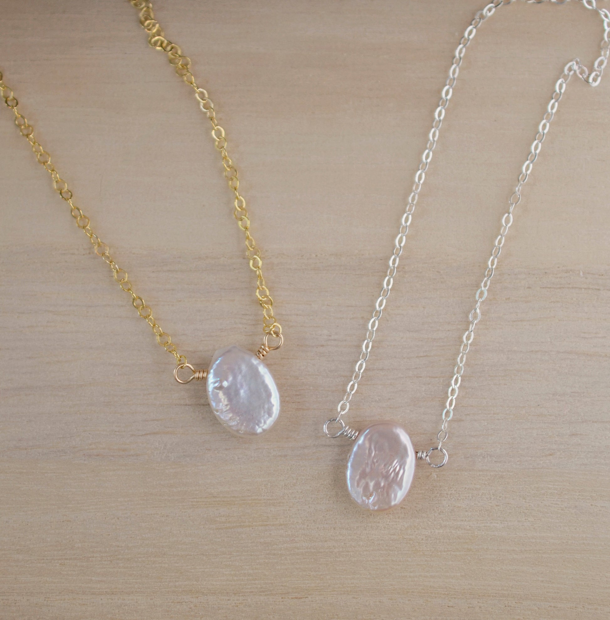 This necklace features a flat oval shaped freshwater pearl. Each pearl is different from the next with natural grooves and ridges along its surface. Chains are available in sterling silver or 14kt gold filled. The average pearl size is 12x9mm (.5x.35").