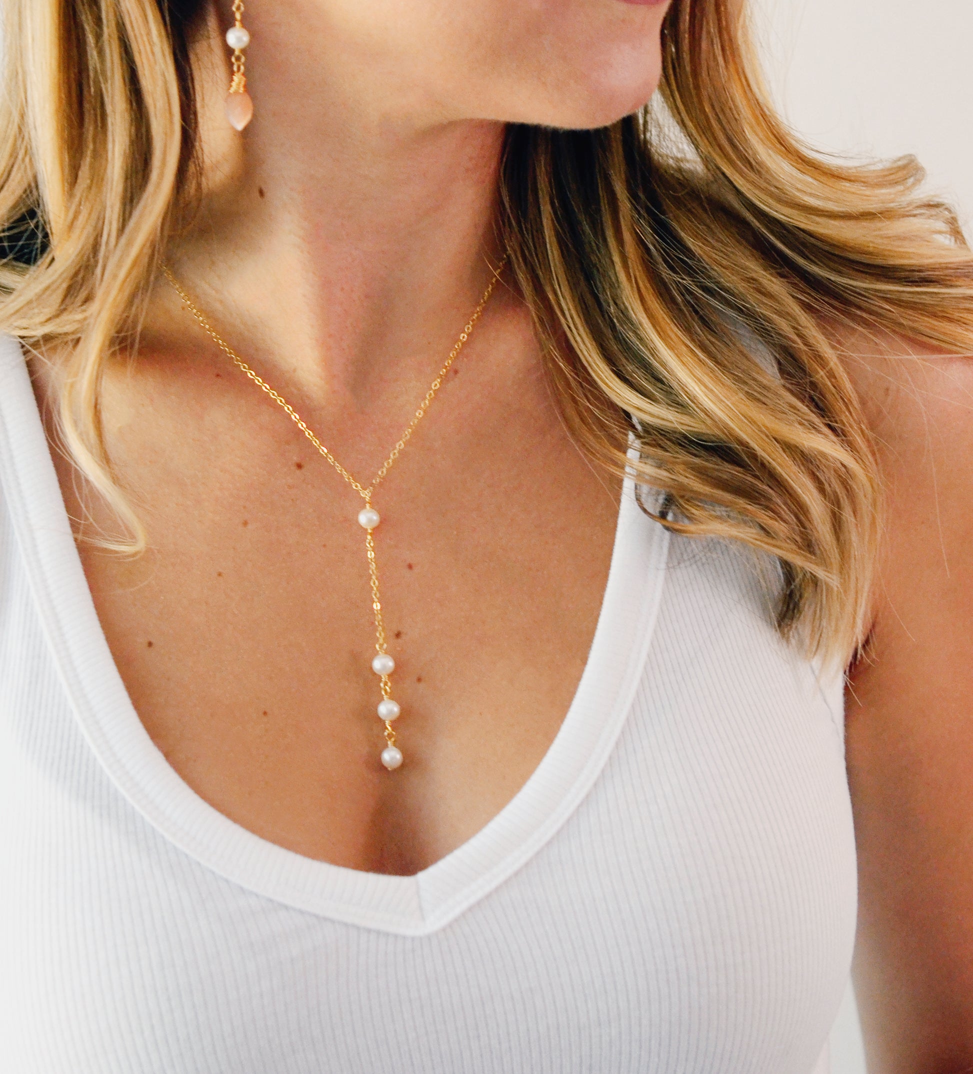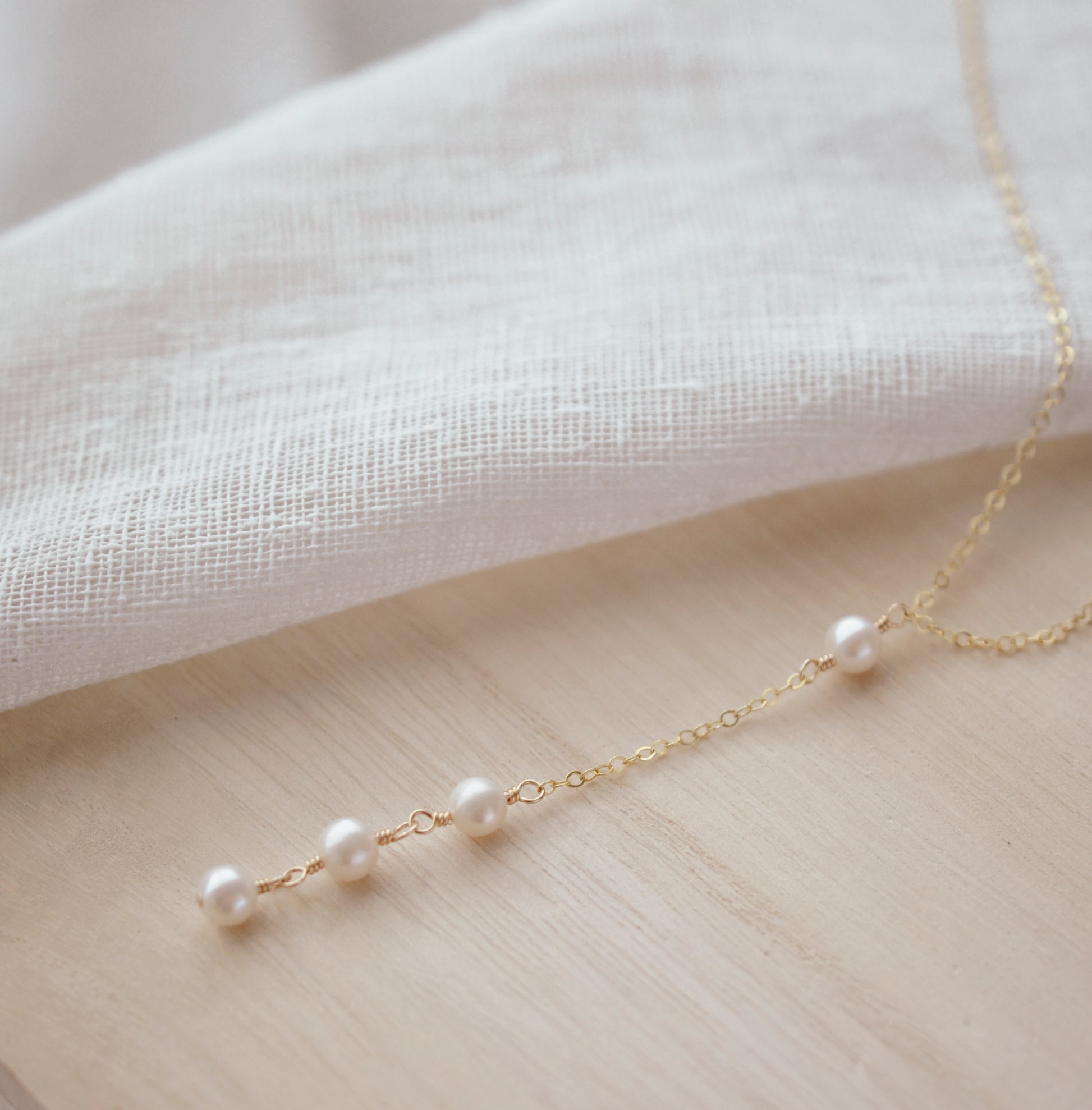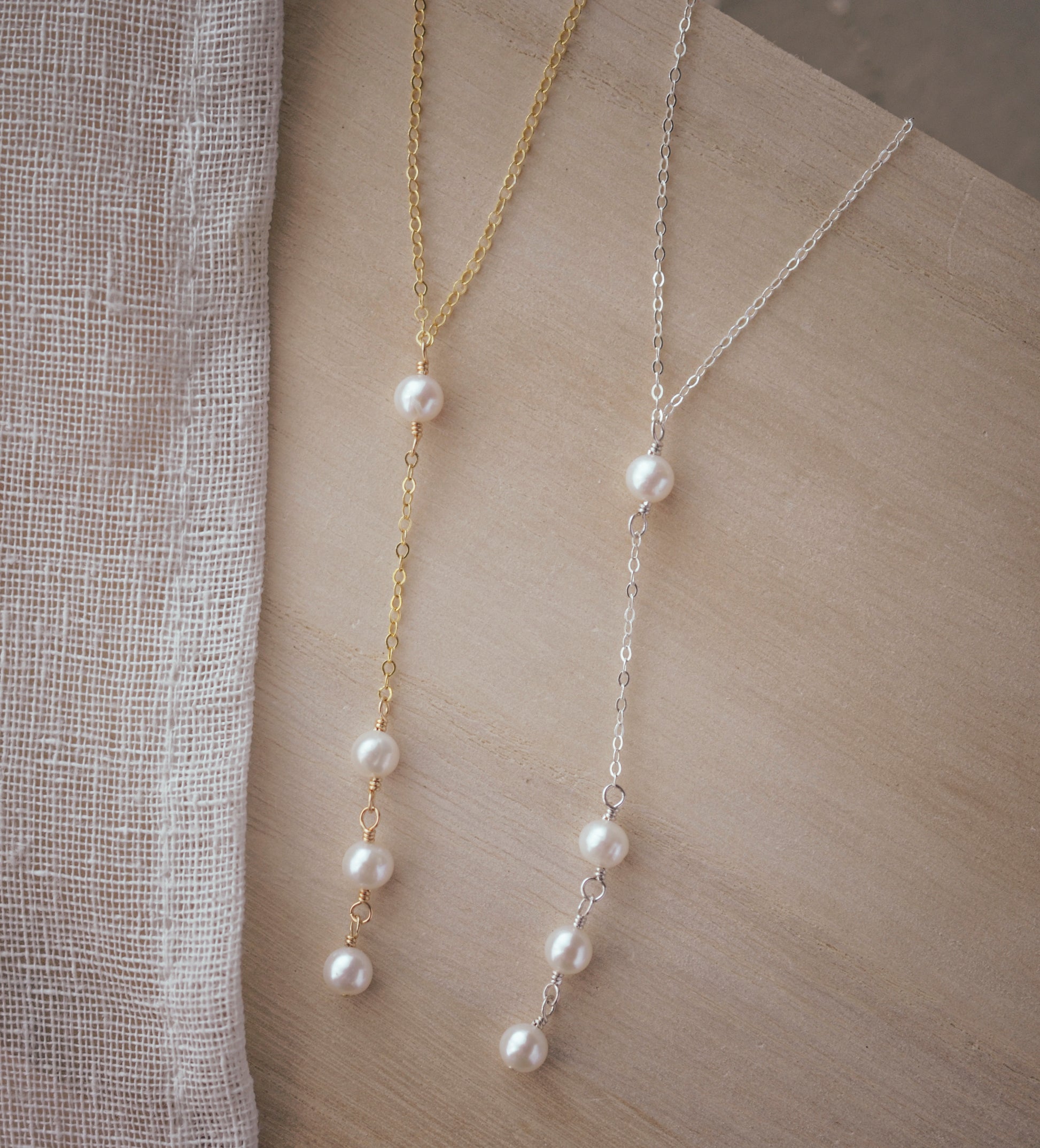 Add some playful elegance to your style with this Y necklace, showcasing four genuine white freshwater pearls dangling from a delicate chain. Each pearl boasts a unique semi-round shape and natural, organic surface. Choose between a sterling silver or a 14k gold filled chain. The pendant hangs 3 inches from the total length of the necklace.